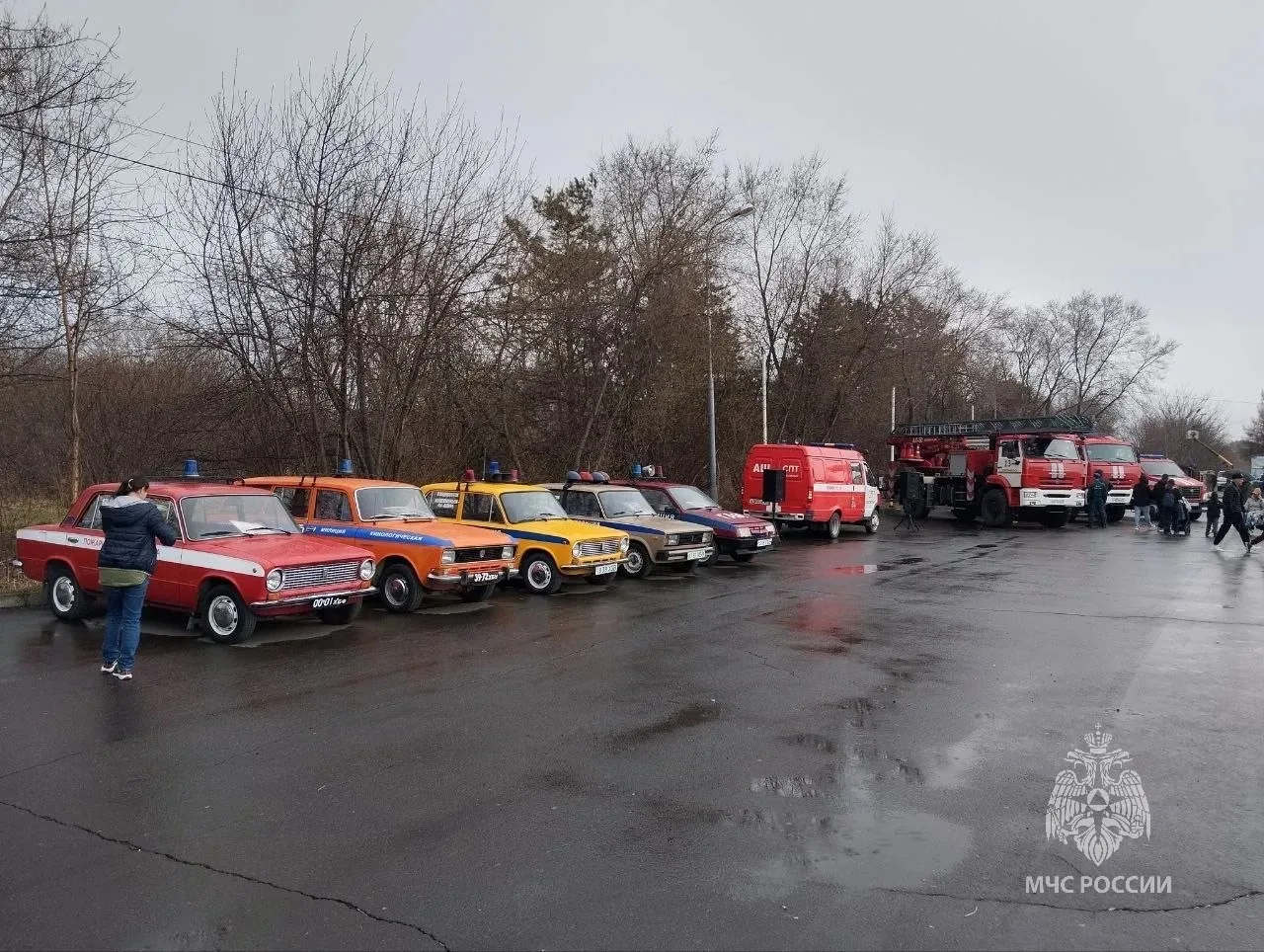 Рядом расположились автомобили в цветографической раскраске разных силовых ведомств, когда-то стоявших на вооружении не только пожарной охраны, но и ГАИ, милиции, кинологической службы и других.