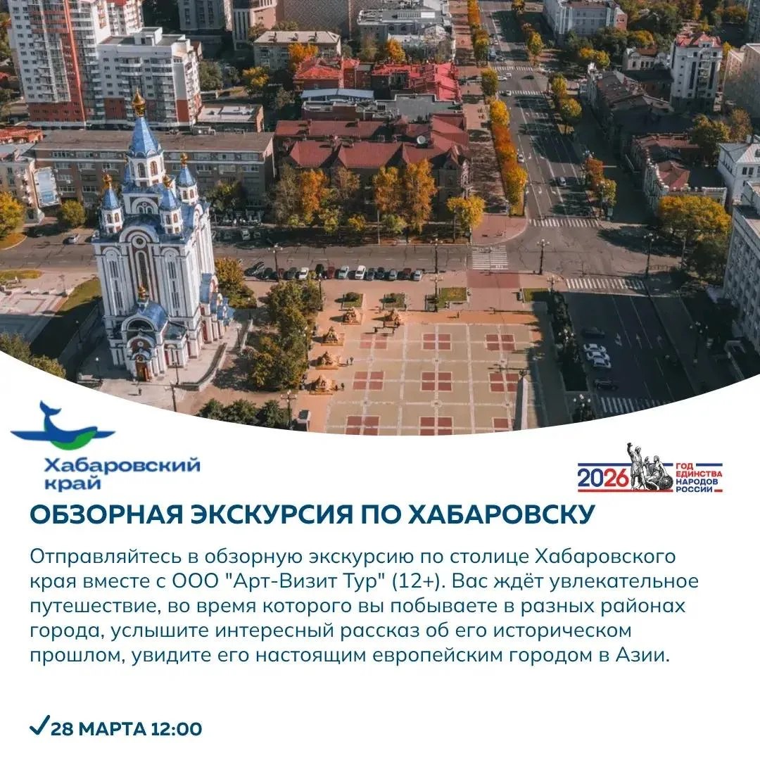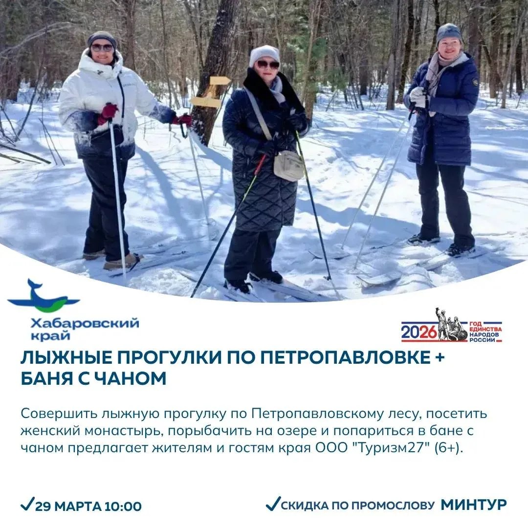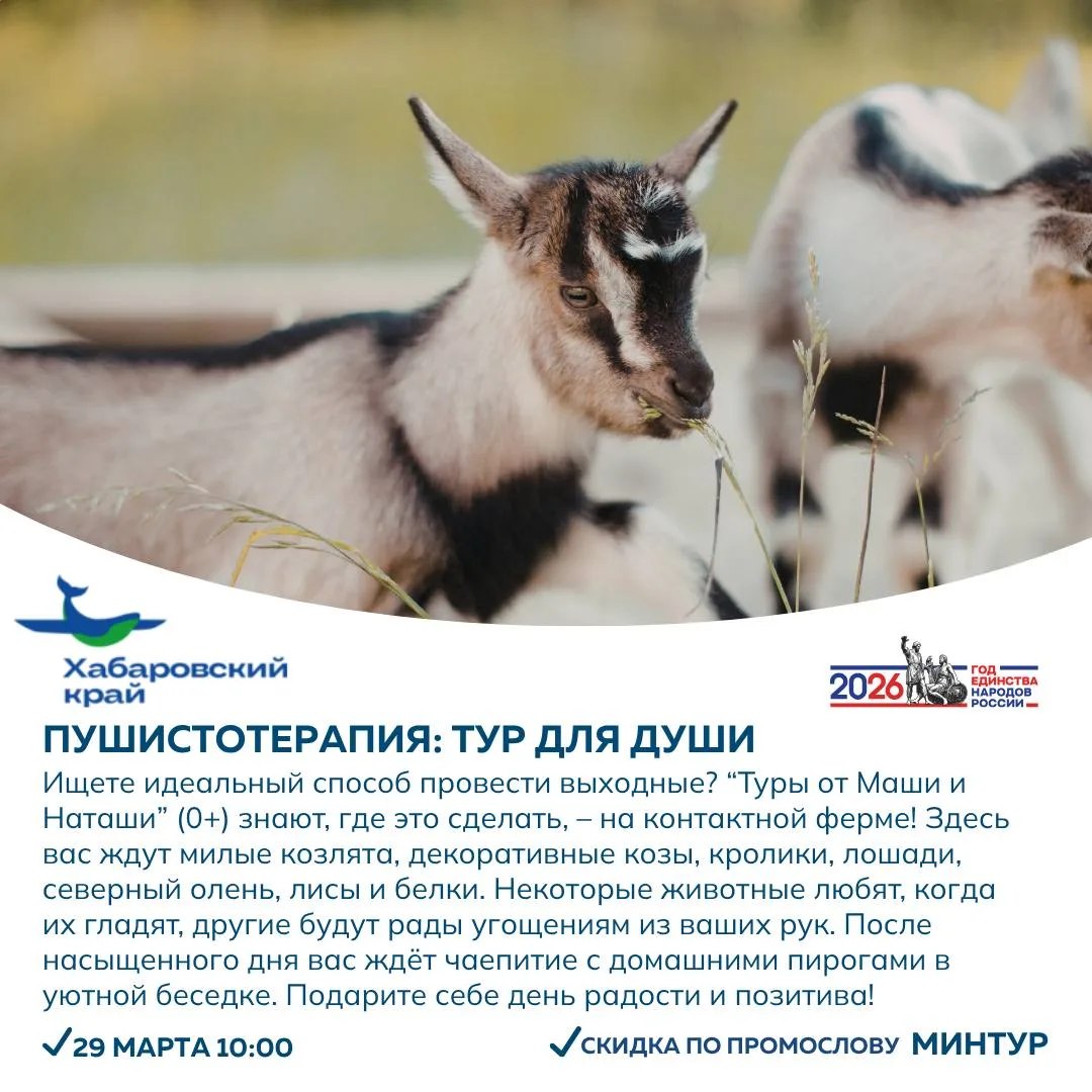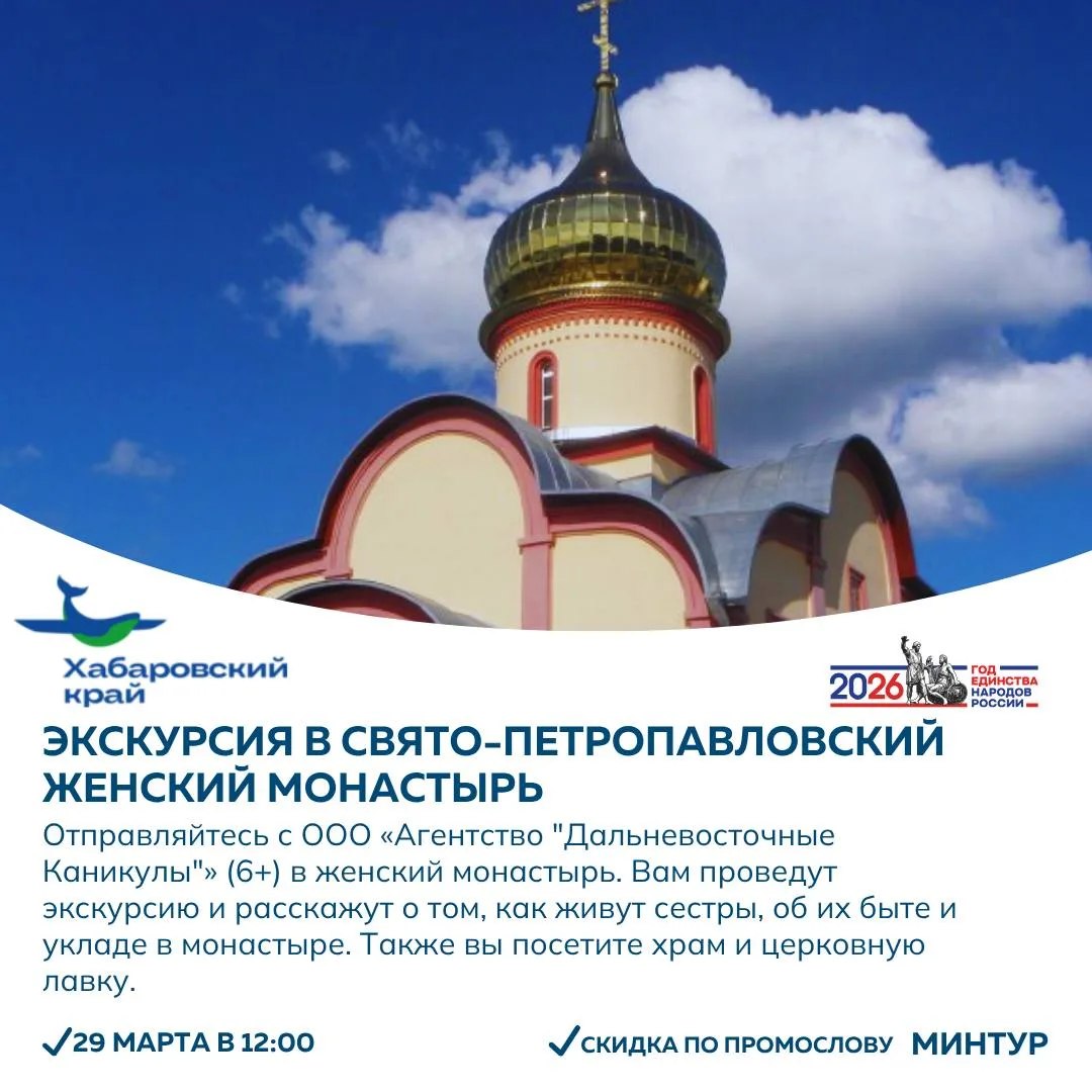 Если хочется спокойнее – подойдёт обзорная экскурсия по Хабаровску или поездка в Свято-Петропавловский женский монастырь. А для тех, кто ищет формат для всей семьи есть тур на контактную ферму с животными и чаепитием.