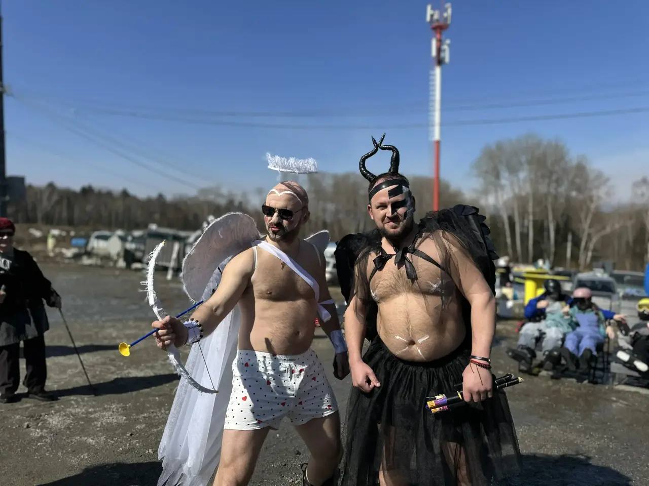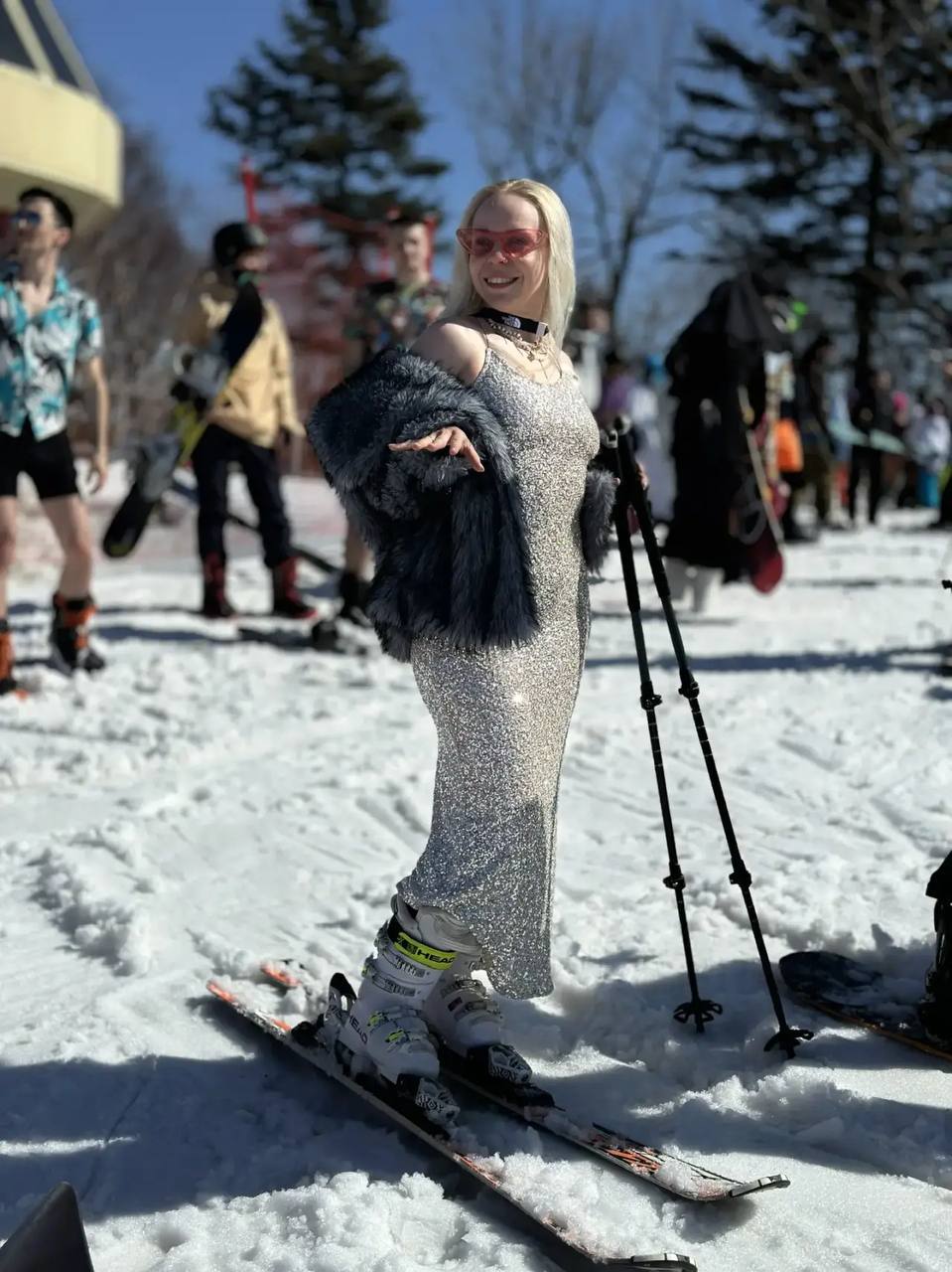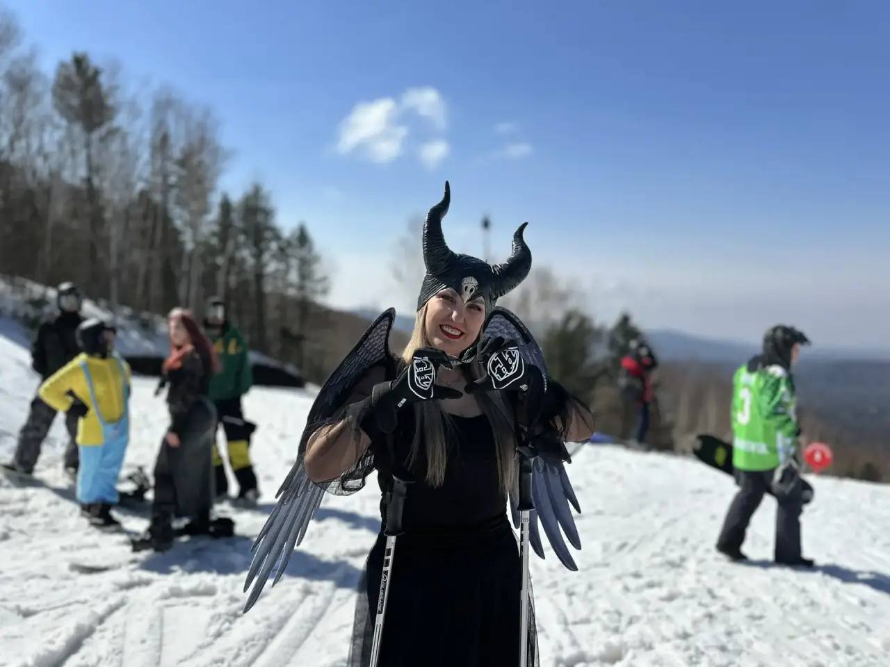Последний день катаний горнолыжники отметили вечеринкой, спуском в костюмах и заездами в бассейн.
