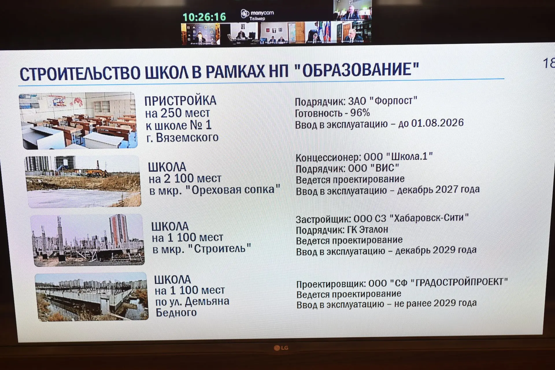 Ускоряем проектирование: этот процесс должен быть значительно сокращен. В частности, срок проектирования школы на 1100 мест в Южном микрорайоне Хабаровска сокращаем на три месяца: с 30 сентября 2026 года на 1 июля. Данный шаг позволит начать строительство уже летом.