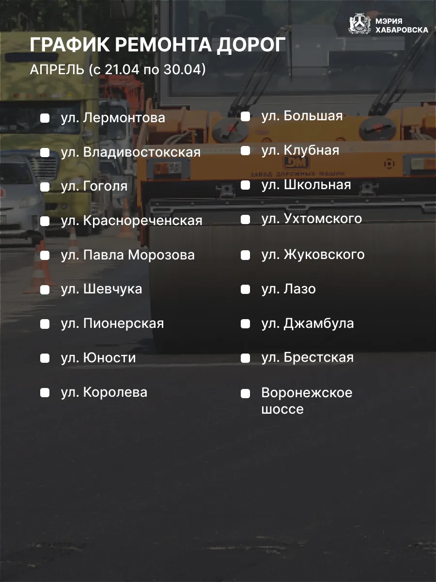 На период до 30 апреля запланирован ремонт участков дорог по улицам: Лермонтова, Владивостокская, Гоголя, Краснореченская, Павла Морозова, Шевчука, Пионерская, Юности, Королева, Большая, Клубная, Школьная, Ухтомского, Жуковского, Лазо, Джамбула, Брестская, Воронежское шоссе.