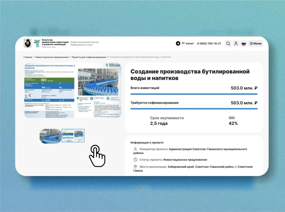 В числе предложений, подготовленных АПИРИ: туристско-рекреационный комплекс в прибрежной зоне бухты Ольга в черте города, рыбоперерабатывающий комплекс полного цикла с холодильными мощностями для хранения выловленных биоресурсов, проект по выпуску бутилированной воды и напитков.