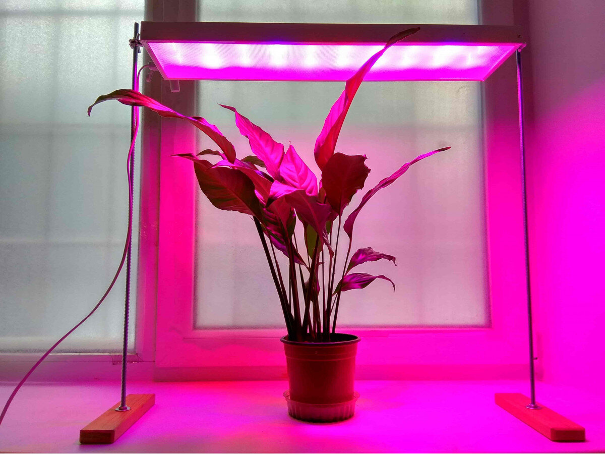 Разделим лампы на четыре типа: белые (полный спектр), розовые (красный свет), синие и фиолетовые (красный и синий свет). В большинстве случаев речь идет о светодиодах, хотя встречаются и люминесцентные варианты. Лампы накаливания, к счастью, вышли из моды.
