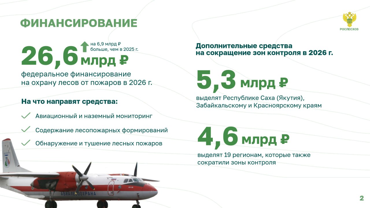 Финансирование на охрану лесов от пожаров в 2026 году увеличено на 6,9 млрд рублей и составляет 26,6 млрд рублей.