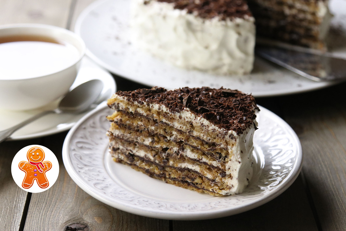 После выпекания коржи оставляют остывать, затем покрывают шоколадной глазурью, состоящей из растопленных шоколада и масла. Глазурь нужно равномерно распределить по пяти коржам, оставив один без глазури.