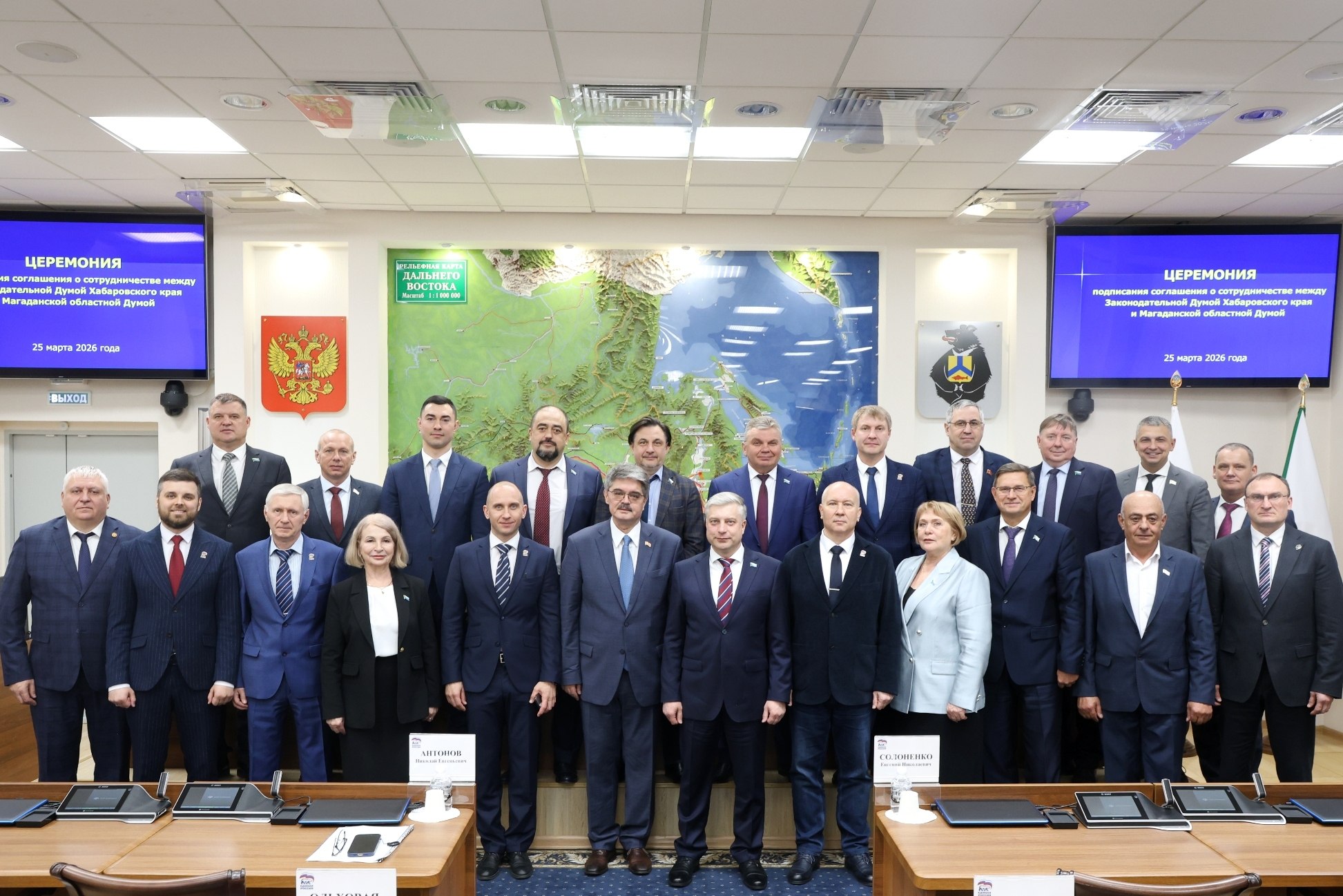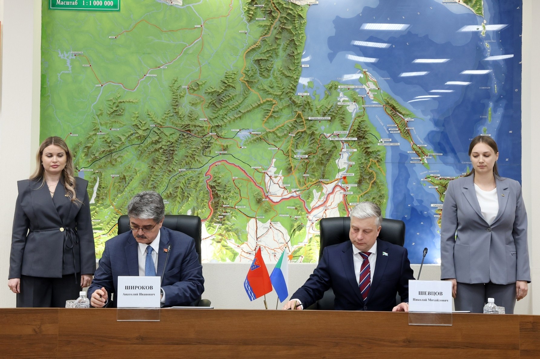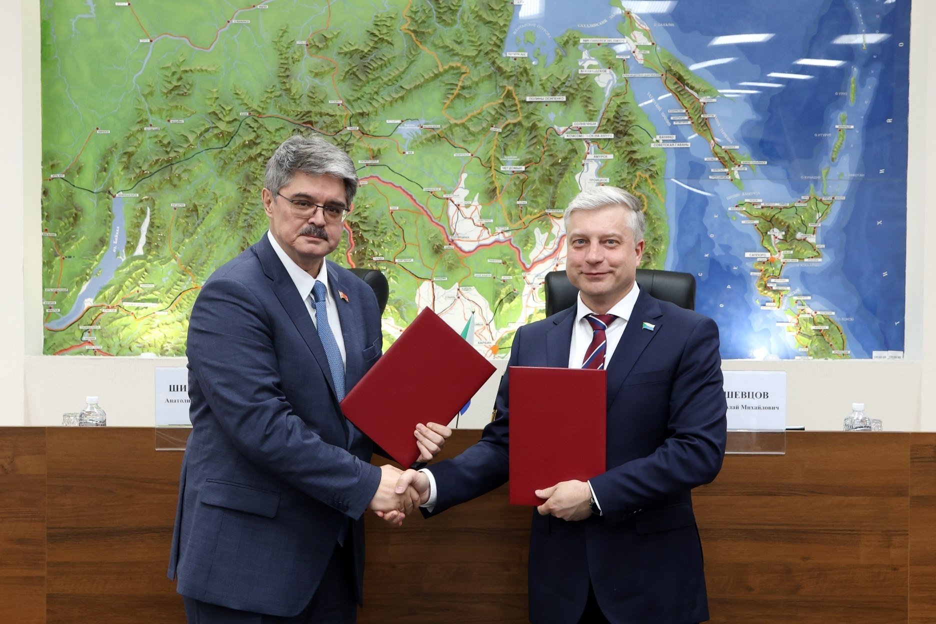 В Хабаровске состоялась торжественная церемония подписания Соглашения о сотрудничестве между Законодательной Думой Хабаровского края и Магаданской областной Думой. Документ скрепили подписями спикеры региональных парламентов Николай Шевцов и Анатолий Широков.