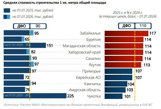 На начало года себестоимость строительства 1 кв. м жилья на Дальнем Востоке в среднем составила 90 тысяч рублей. Самый дорогой «квадрат» оказался на Чукотке – 225 тысяч рублей, а самый дешевый в Бурятии – 65 тысяч рублей.