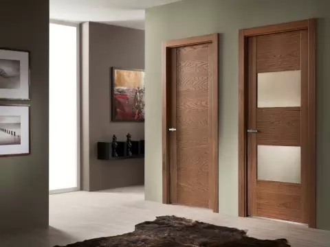 - Шпон. Этот вариант предлагает сочетание доступности и красоты. Двери из менее ценных пород древесины, оклеенные шпоном, обладают привлекательным внешним видом и высоким качеством при правильном уходе.