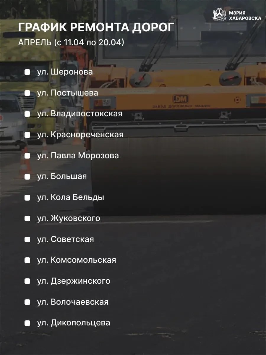 На период до 20 апреля запланирован ремонт участков дорог по улицам, указанным в карточке.