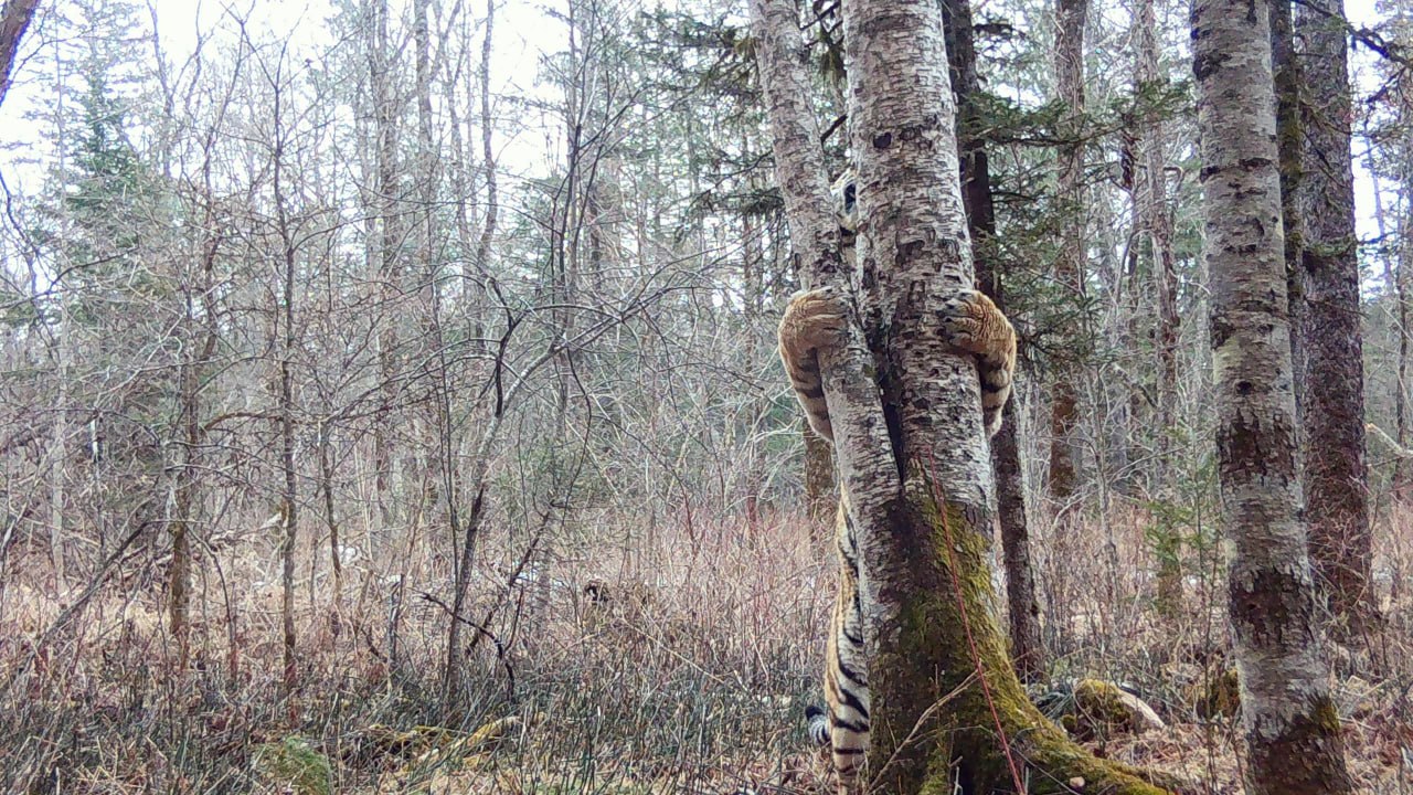 Тигр «спрятался» за деревом в приморском нацпарке