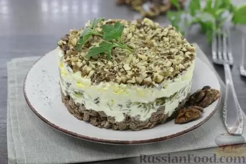 - Слоёный салат с говядиной: Мягкое, отварное мясо в сочетании с хрустящими солёными огурцами и нежными вареными яйцами создадут великолепный ансамбль. Продукты выкладываются слоями и щедро смазываются майонезом, а для красоты можно добавить грецкие орехи.