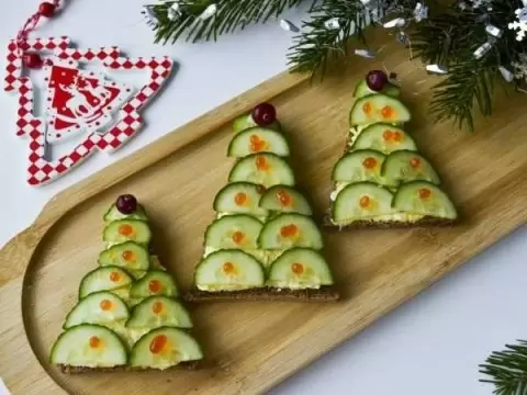 Каждый треугольник хлеба щедро намажьте сырно-яичной массой и аккуратно положите огурцы так, чтобы они напоминали веточки ёлки. В завершение украсьте «Ёлочку» на свой вкус, добавив разнообразные элементы декора. Ваши бутерброды не только создадут атмосферу праздника, но и удивят всевозможными вкусами!