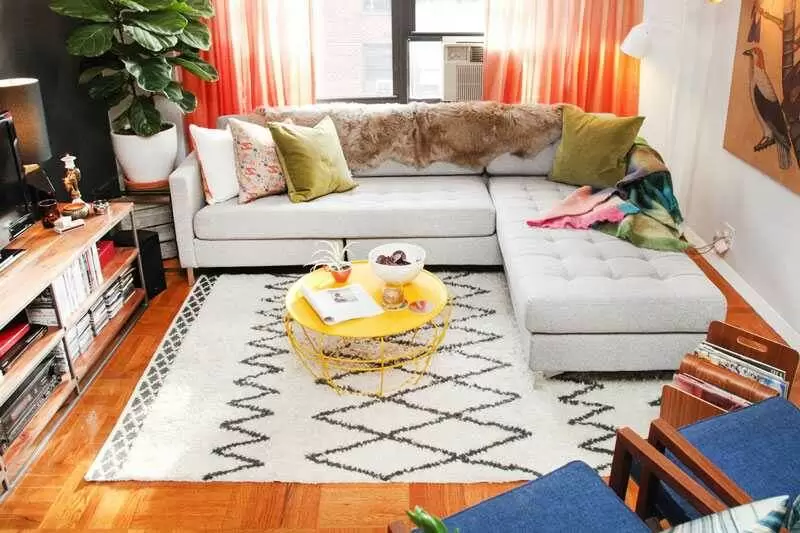 Правило заключается в том, что диван или передние ножки другой мебели могут находиться на ковре. Однако отстоят от стен в пределах как минимум 15 сантиметров. Большой ковер не только добавляет уюта, но и завершает пространство, формируя единое целое. Как вариант, можно экспериментировать с многослойными вариантами. Например, сначала стелим большой ковер, а затем добавляем на него маленький, идеально подходящий по цвету и узору. Так можно создать интересный визуальный эффект.