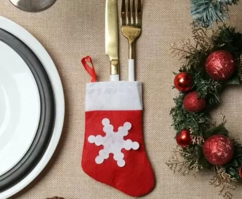 - Конверт для приборов в виде рождественского носка: этот оригинальный аксессуар моментально придаст праздничный вид вашему столу. Красные, зелёные и белые варианты легко впишутся в любой интерьер, придавая сервировке особый шарм.