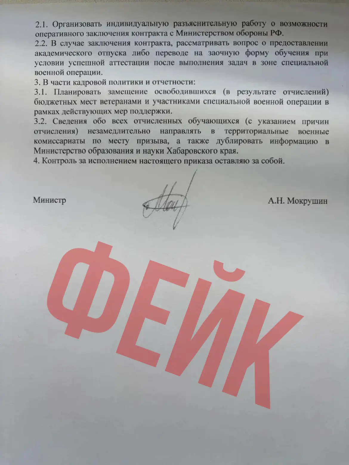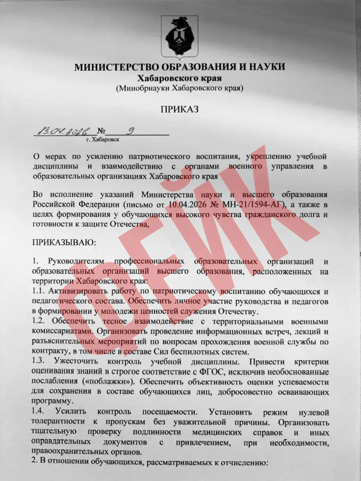 ФЕЙК: министерство образования и науки Хабаровского края выпустило приказ «О мерах по усилению патриотического воспитания, укреплению учебной дисциплины и взаимодействию с органами военного управления в образовательных организациях Хабаровского края»