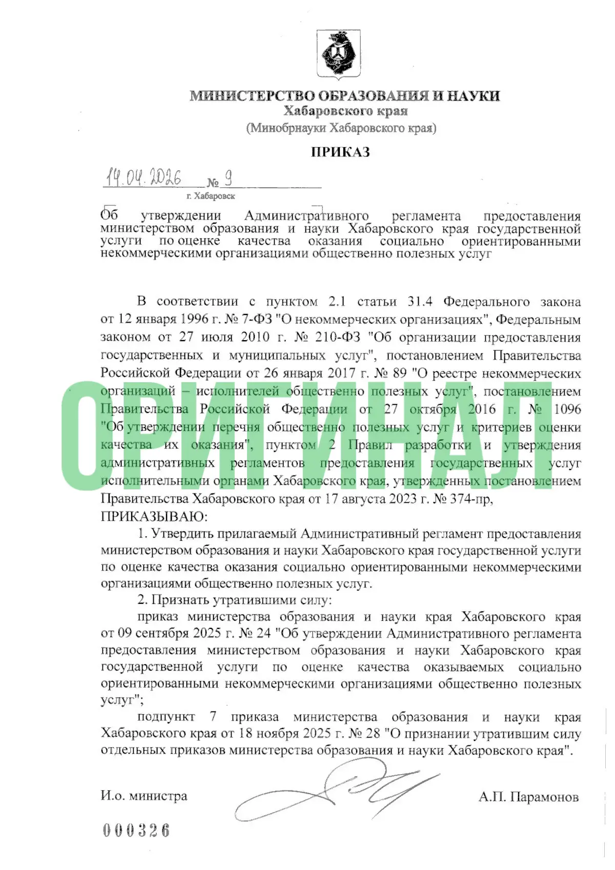 1. Приказ № 9 зарегистрирован от 14.04.2026 и размещен в открытых источниках: «Об утверждении Административного регламента предоставления министерство образования и науки Хабаровского края государственной услуги по оценке качества оказания социально ориентированными некоммерческими организациями общественно полезных услуг».