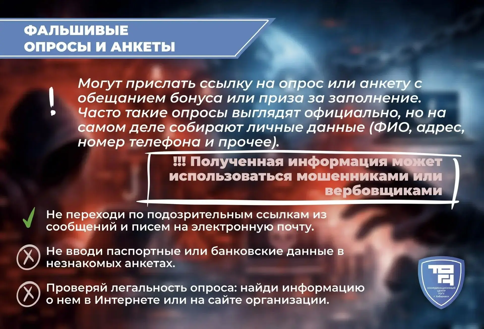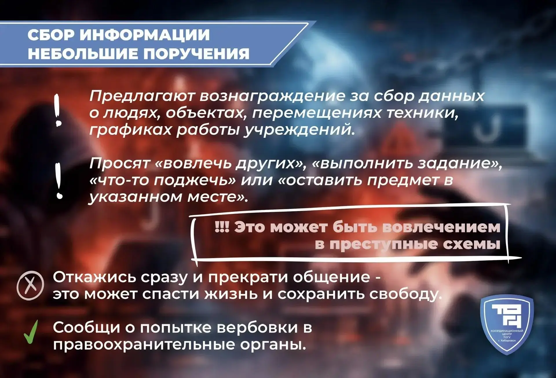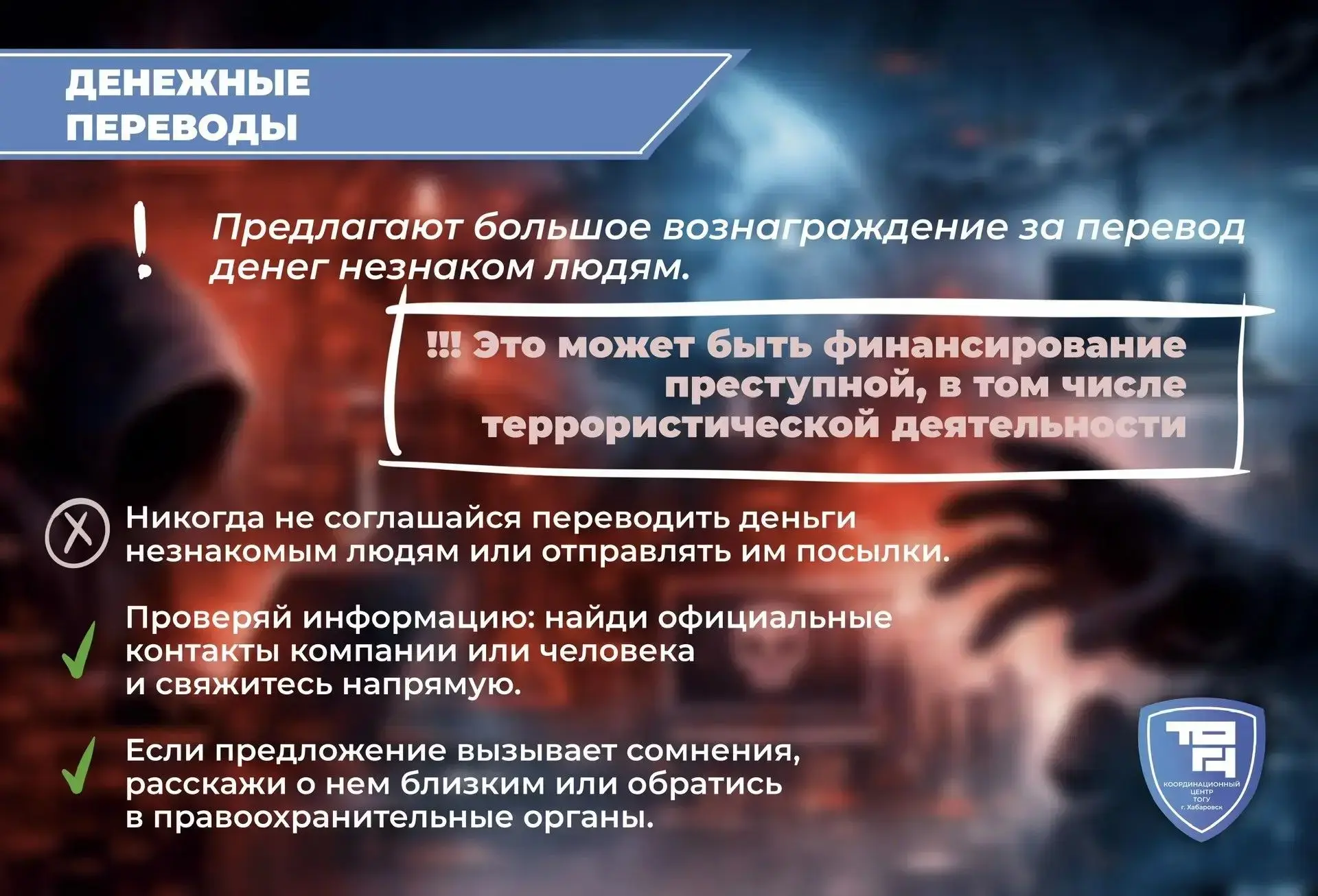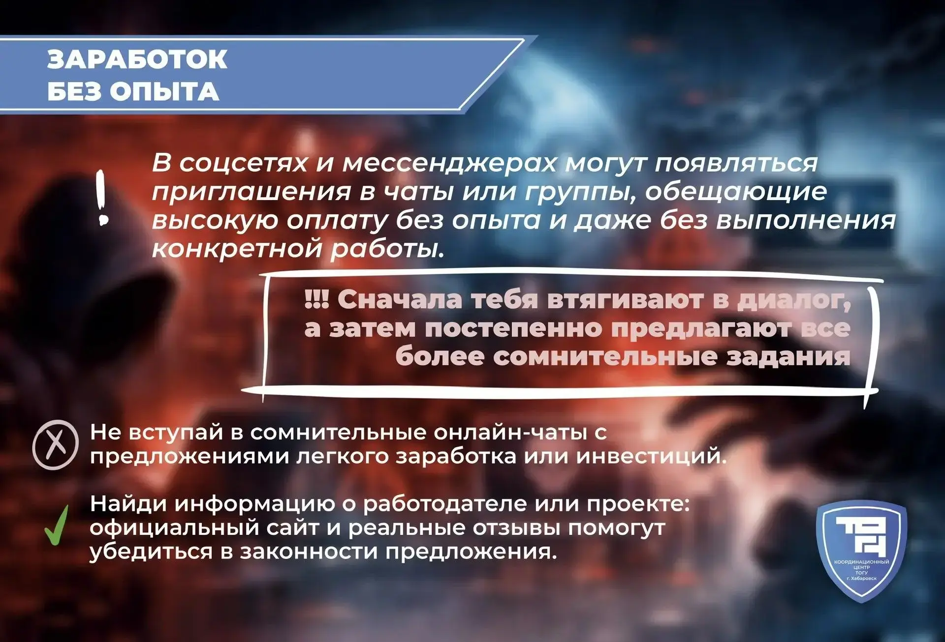 Координационный центр ТОГУ (https://clc.li/QPmKn) предупреждает: обещания лёгкого заработка, помощь «просто так» или сомнительные опросы могут быть не безобидными, а первым шагом в преступную схему. Вербовщики используют давление, незнание и даже заботу, чтобы втянуть в незаконные действия.