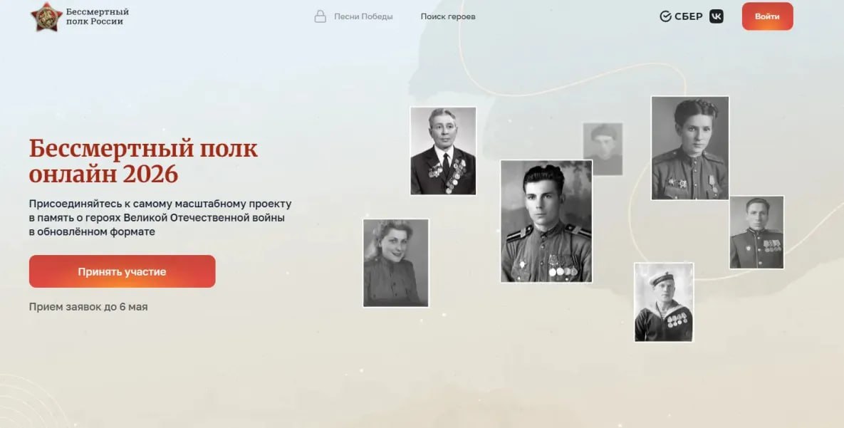 Цифровое шествие героев Великой Отечественной войны пройдёт в День Победы, 9 мая. Приём заявок на участие продлится до 6 мая. Подать заявку все желающие могут на сайте 2026.polkrf.ru или в мини-приложениях ВКонтакте, Одноклассники и МАХ.
