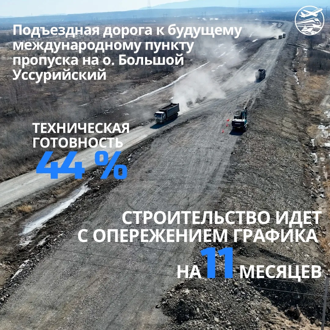 Продолжается строительство дороги к будущему пункту пропуска на острове Большой Уссурийский - важного транспортного узла края. Текущая готовность объекта - 44%.