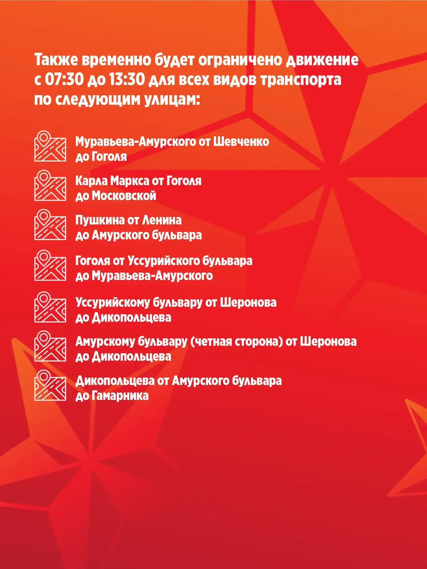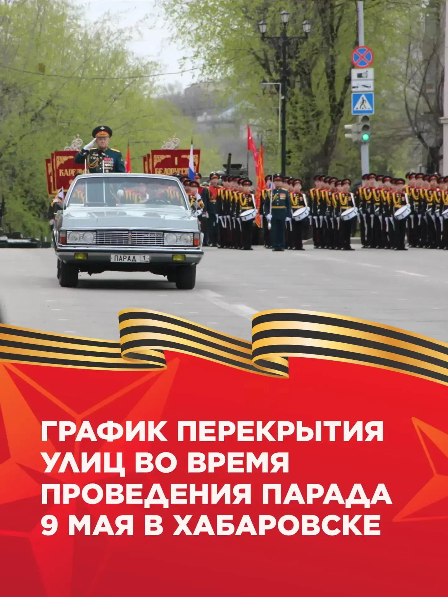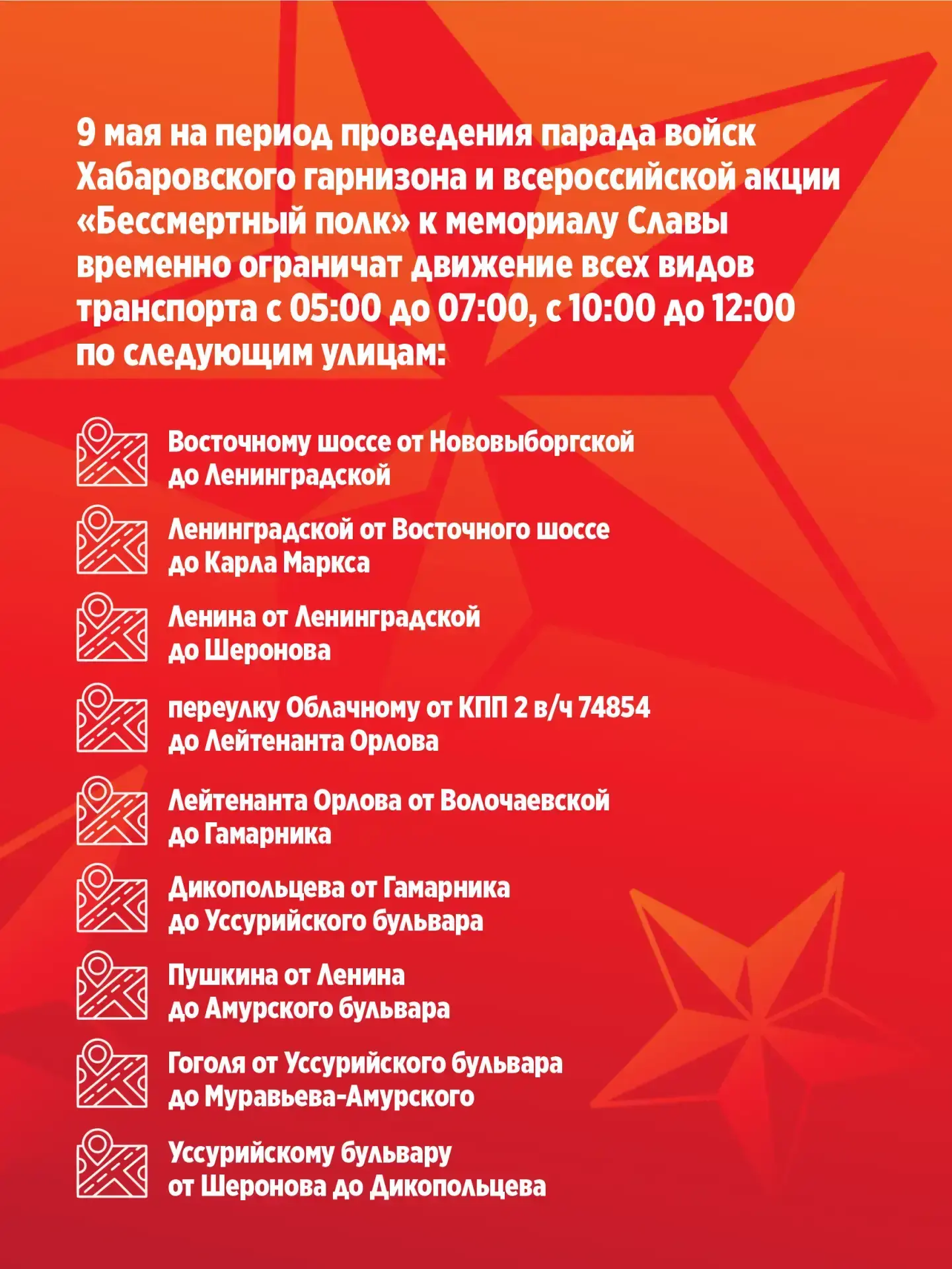 9 мая на период проведения парада войск Хабаровского гарнизона, всероссийской акции «Бессмертный полк» к мемориалу Славы и праздничного салюта временно будет ограничено движение всех видов транспорта.