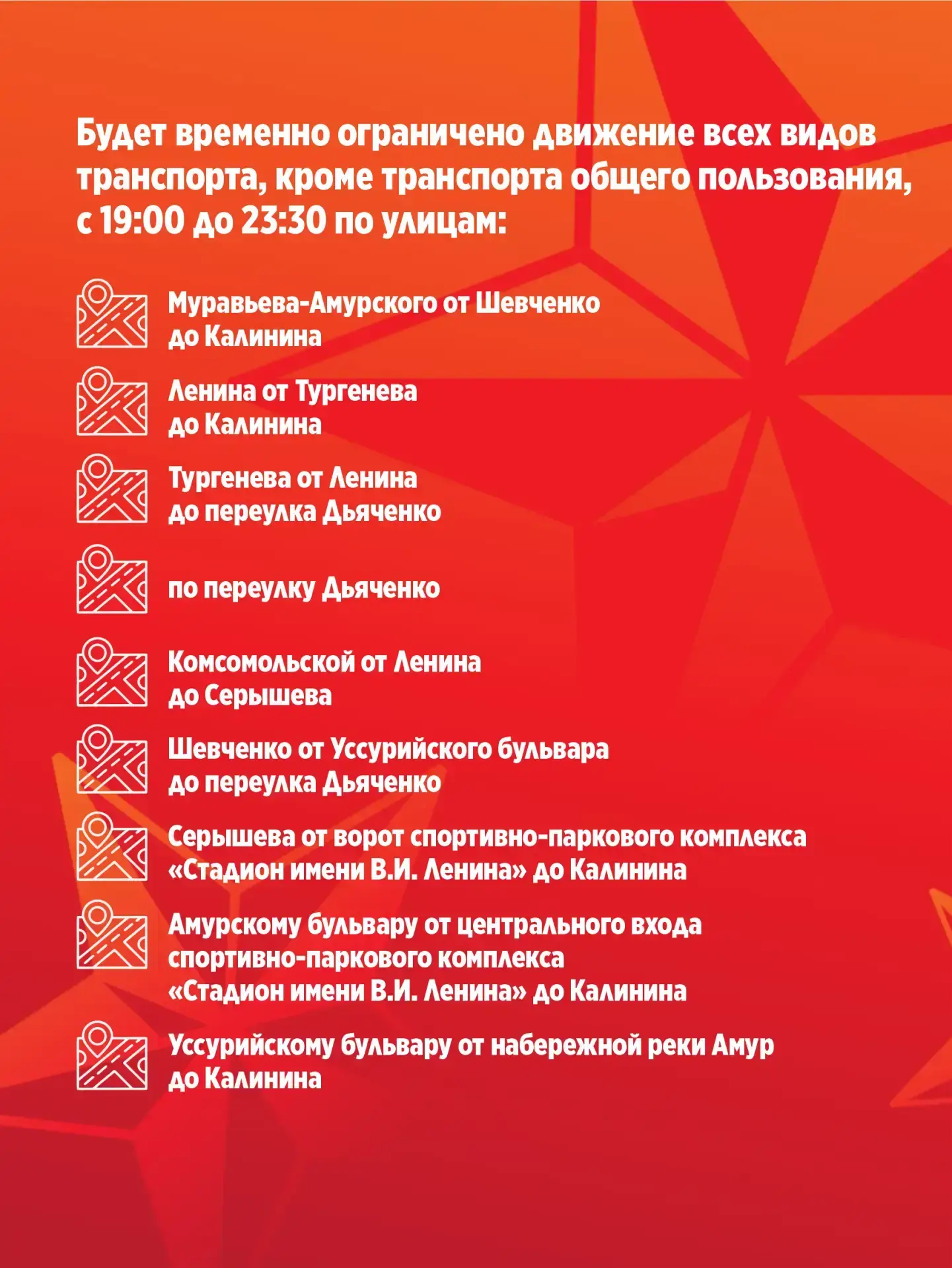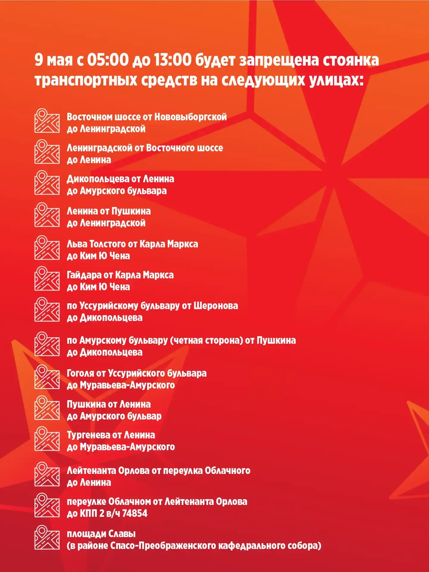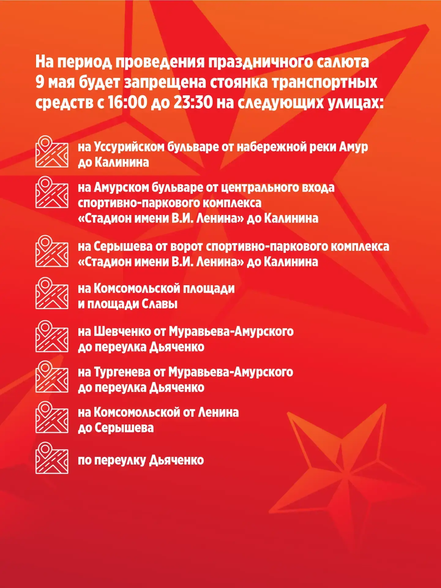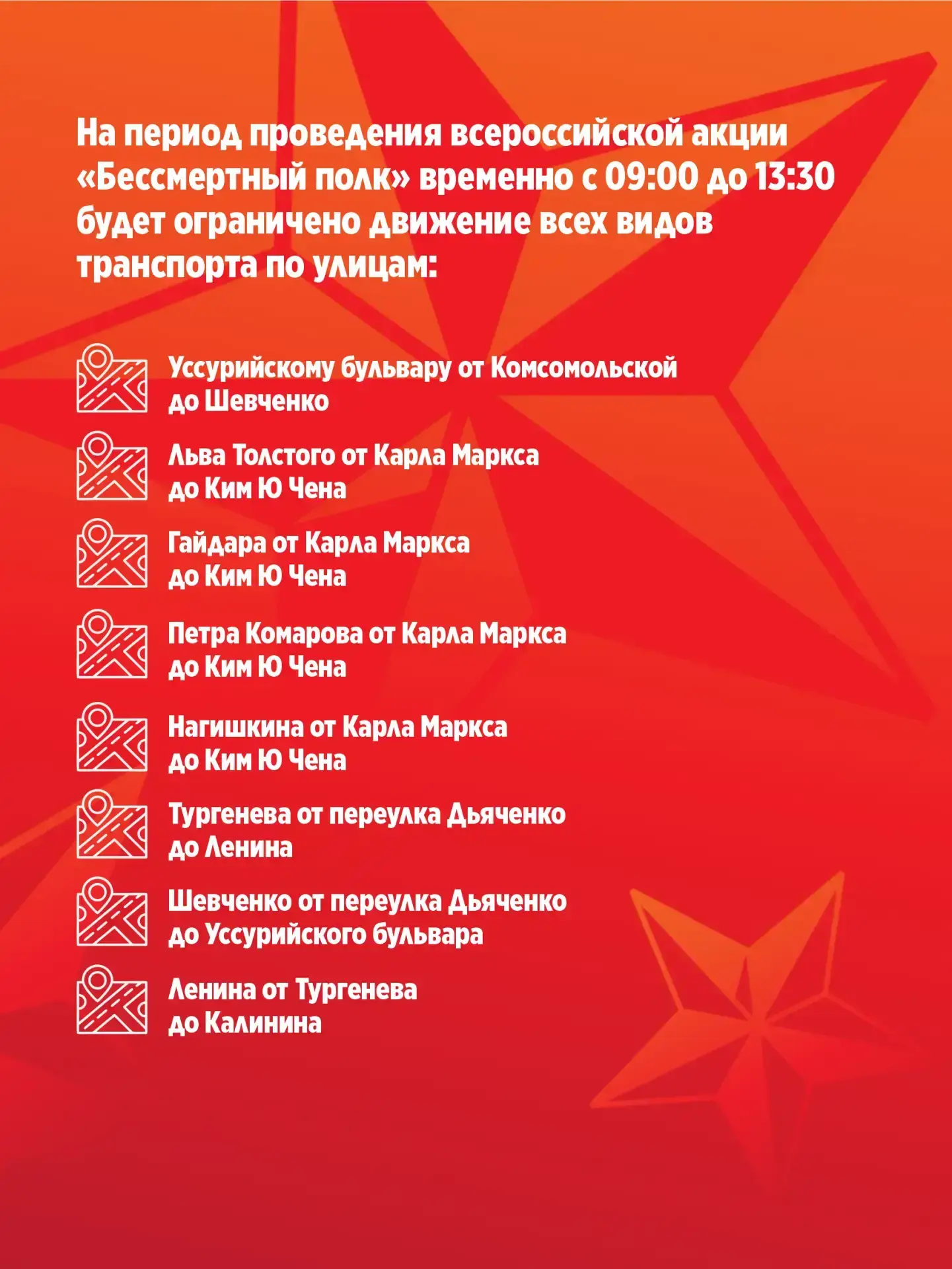 9 мая на период проведения парада войск Хабаровского гарнизона, всероссийской акции «Бессмертный полк» к мемориалу Славы и праздничного салюта временно будет ограничено движение всех видов транспорта.