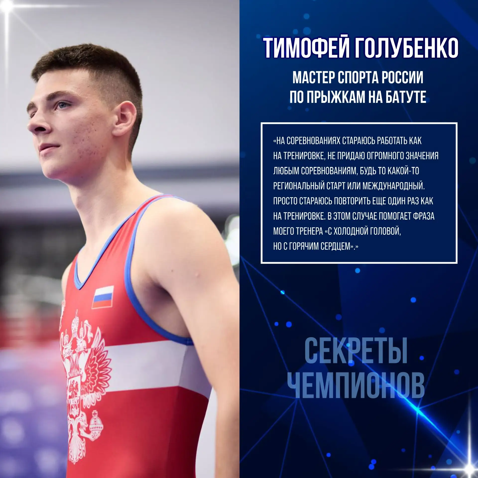 Тимофей Голубенко – мастер спорта России по прыжкам на батуте. Кроме того, он является чемпионом Европы в командном зачете и бронзовым призером в индивидуальном выступлении, а также чемпион России в командном зачете.